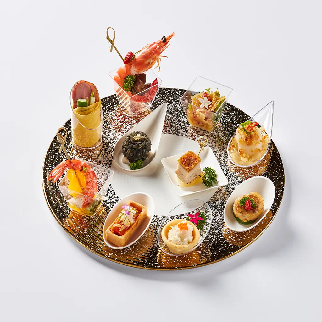 Treat your guests to luxurious seafood canapés, including Truffle Egg White Crab Tartelette and Drunken Prawn with Black Fungus prepared with the finest ingredients